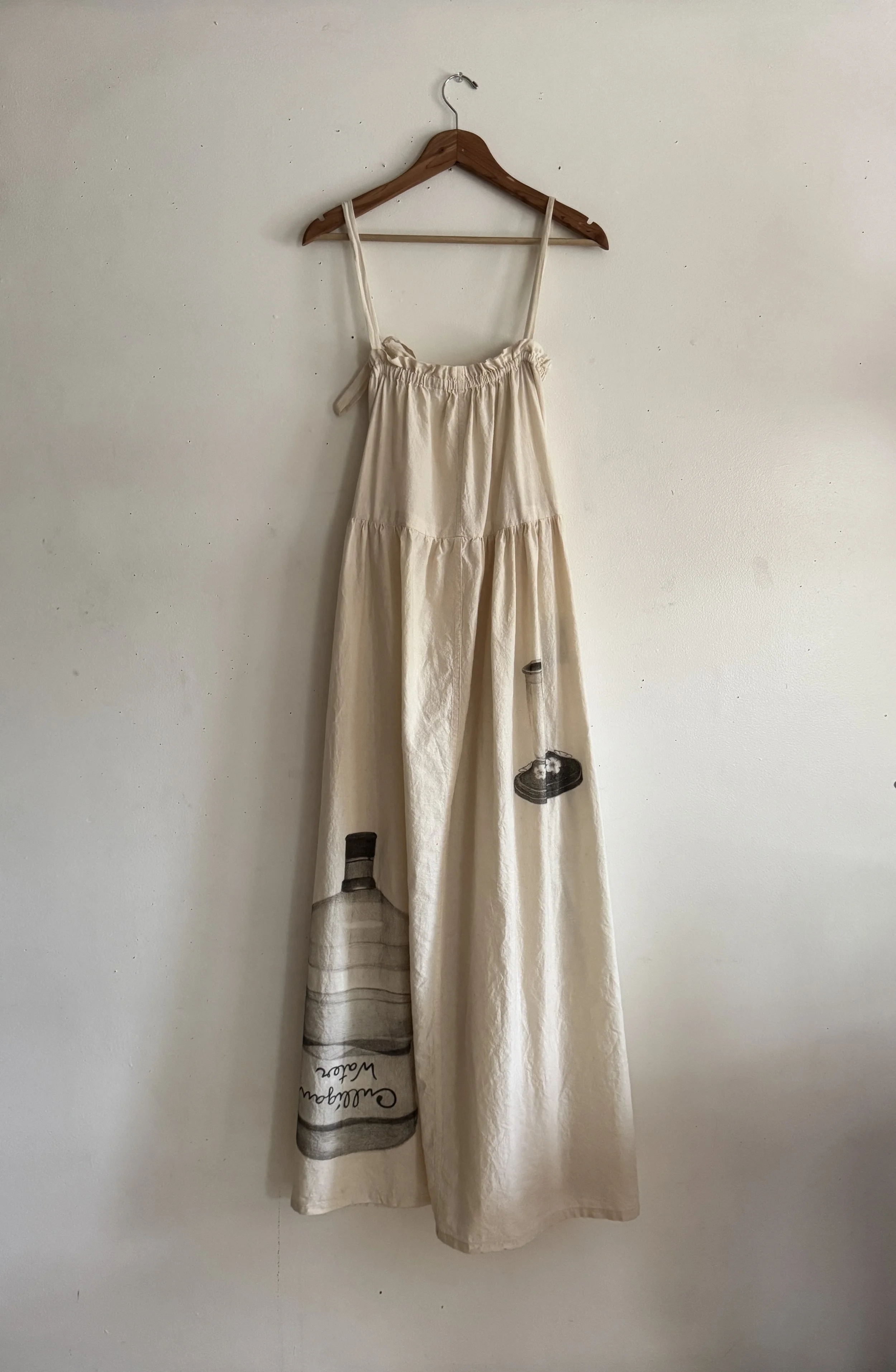 Cotton Maxi dress with hand-drawn illustrations featuring a plastic bird feeder, 5-gallon Culligan water bottle, a wooden chair and a Mulato pepper. Elastic band above chest and adjustable ties for comfort and ease of movement.